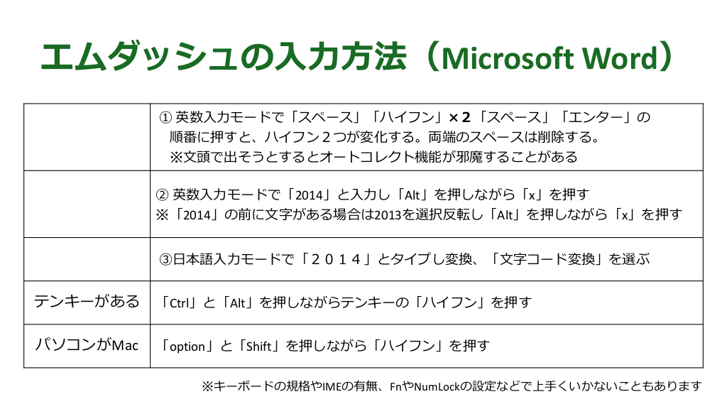 #9. エムダッシュの入力方法(Microsoft Word) ① 英数入力モードで「スペース」「ハイフン」×2「スペース」「エンター」の 順番に押すと、ハイフン2つが変化する。両端のスペースは削除する。 ※文頭で出そうとするとオートコレクト機能が邪魔することがある ② 英数入力モードで「2014」と入力し「Alt」を押しながら「x」を押す ※「2014」の前に文字がある場合は2013を選択反転し「Alt」を押しながら「x」を押す ③日本語入力モードで「2014」とタイプし変換、「文字コード変換」を選ぶ テンキーがある 「Ctrl」と「Alt」を押しながらテンキーの「ハイフン」を押す パソコンがMac 「option」と「Shift」を押しながら「ハイフン」を押す ※キーボードの規格やIMEの有無、FnやNumLockの設定などで上手くいかないこともあります