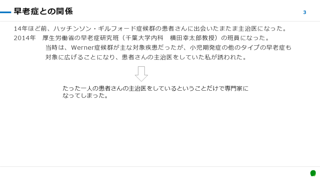 このスライドでは、HGPSの患者さんの診療を現在行い、厚生労働省難治疾患研究班にも参画する松尾教授が、希少難治性疾患の診療の実際、海外の国際治験への参加、希少難病の患者さん・家族を取り巻く環境についてなど、今後難病・希少疾患に出会う可能性のあるすべての医師へ共有したい学びを伝えます。