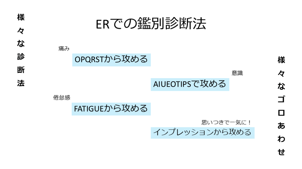 #2. ERでの鑑別診断法 OPQRSTから攻める AIUEOTIPSで攻める FATIGUEから攻める インプレッションから攻める 様々な診断法 様々なゴロあわせ 痛み 意識 倦怠感 思いつきで一気に!