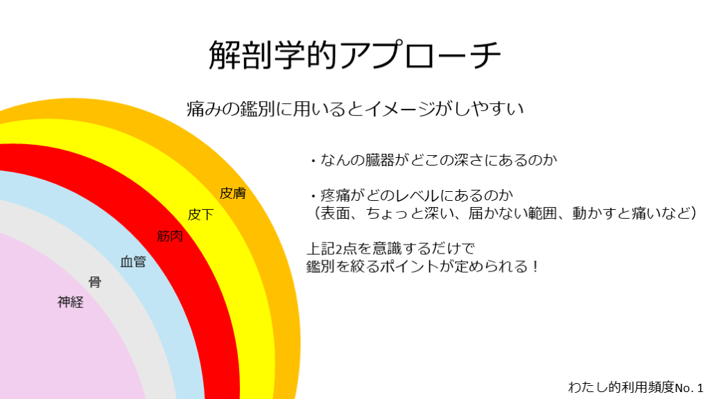 #4. 解剖学的アプローチ 痛みの鑑別に用いるとイメージがしやすい 皮膚 皮下 筋肉 血管 骨 神経 ・なんの臓器がどこの深さにあるのか