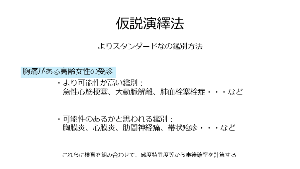 #7. 仮説演繹法 よりスタンダードなの鑑別方法 胸痛がある高齢女性の受診 ・より可能性が高い鑑別: