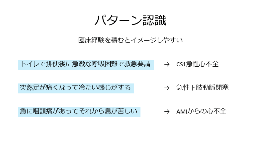 #8. パターン認識 臨床経験を積むとイメージしやすい トイレで排便後に急激な呼吸困難で救急要請 突然足が痛くなって冷たい感じがする 急に咽頭痛があってそれから息が苦しい → CS1急性心不全 → 急性下肢動脈閉塞 → AMIからの心不全