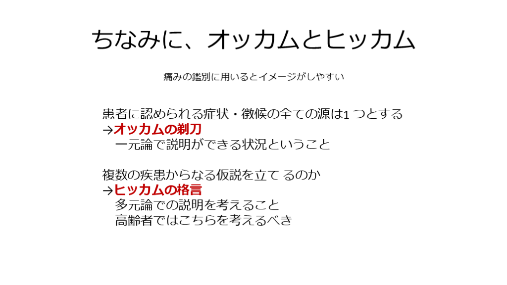 #10. ちなみに、オッカムとヒッカム 痛みの鑑別に用いるとイメージがしやすい 患者に認められる症状・徴候の全ての源は1 つとする