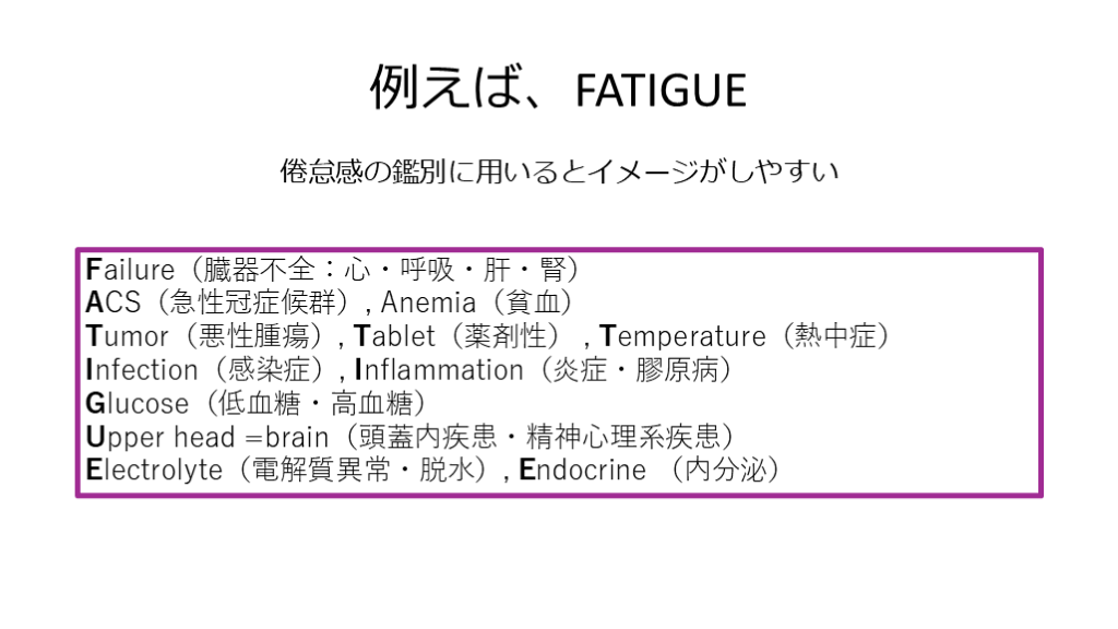 #12. 例えば、FATIGUE 倦怠感の鑑別に用いるとイメージがしやすい Failure(臓器不全:心・呼吸・肝・腎)