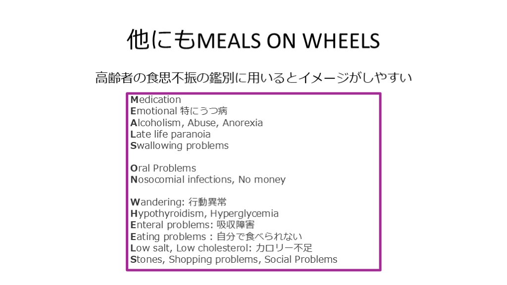 #13. 他にもMEALS ON WHEELS 高齢者の食思不振の鑑別に用いるとイメージがしやすい MedicationEmotional 特にうつ病Alcoholism, Abuse, AnorexiaLate life paranoiaSwallowing problemsOral ProblemsNosocomial infections, No moneyWandering: 行動異常Hypothyroidism, HyperglycemiaEnteral problems: 吸収障害Eating problems : 自分で食べられないLow salt, Low cholesterol: カロリー不足Stones, Shopping problems, Social Problems