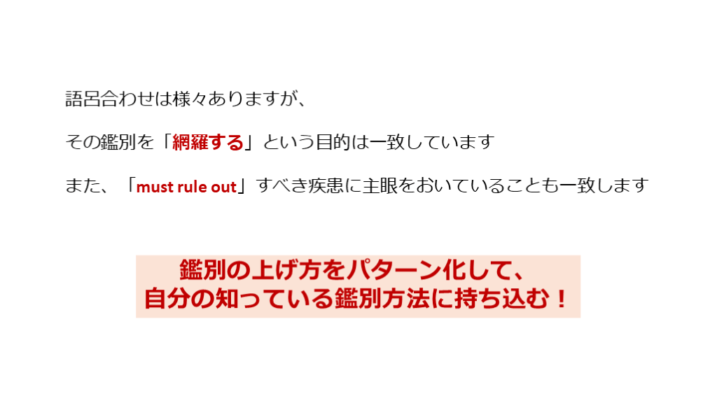 また、「must rule out」すべき疾患に主眼をおいていることも一致します 鑑別の上げ方をパターン化して、