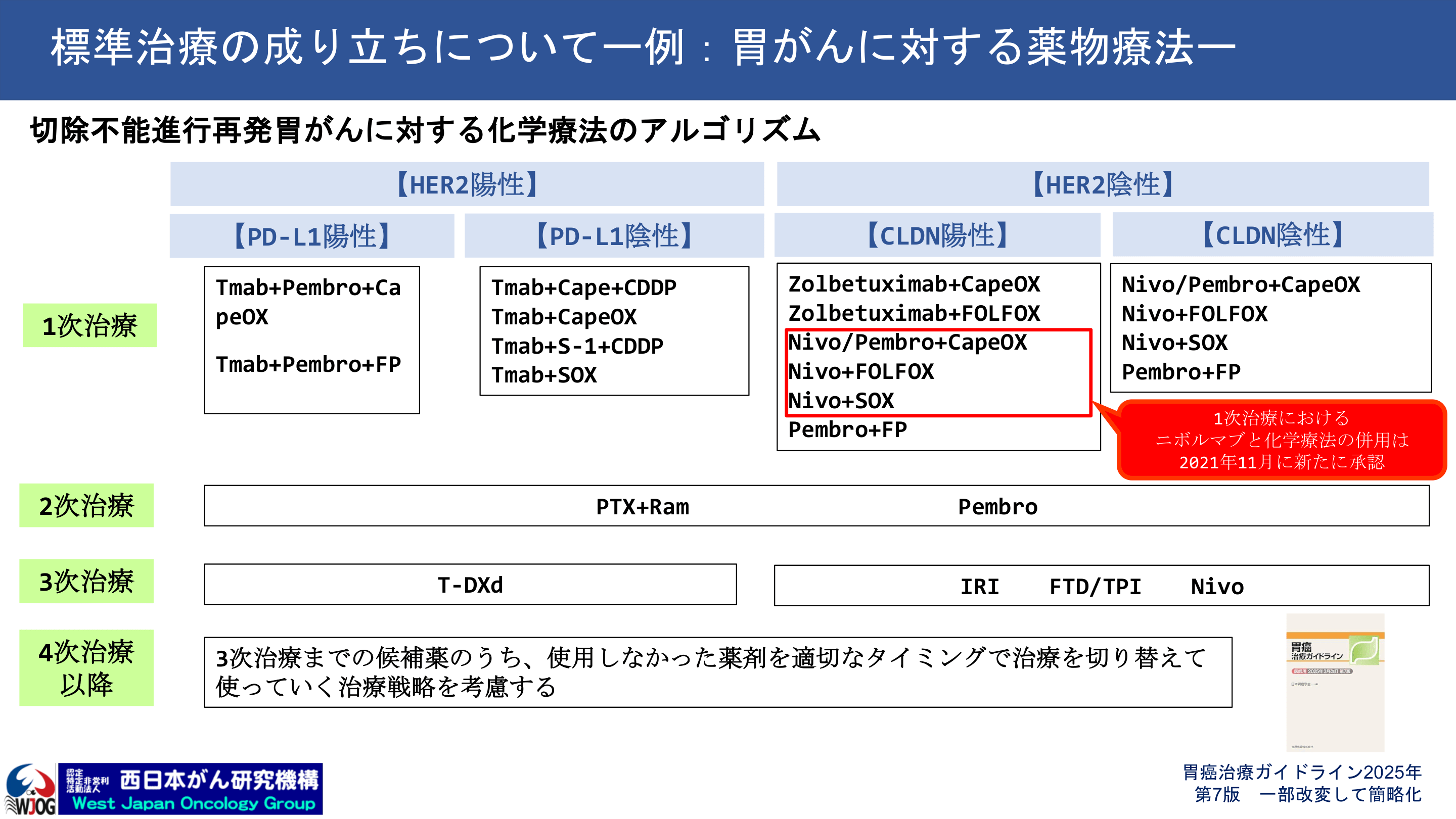 #3. 標準治療の成り立ちについてー例:胃がんに対する薬物療法ー 切除不能進行再発胃がんに対する化学療法のアルゴリズム 【HER2陽性】 【PD-L1陰性】  【PD-L1陽性】 1次治療  Tmab+Pembro+Ca peOX Tmab+Pembro+FP  Tmab+Cape+CDDP Tmab+CapeOX Tmab+S-1+CDDP Tmab+SOX  2次治療 3次治療 4次治療 以降  【HER2陰性】  PTX+Ram T-DXd  【CLDN陰性】  【CLDN陽性】 Zolbetuximab+CapeOX Zolbetuximab+FOLFOX Nivo/Pembro+CapeOX Nivo+FOLFOX Nivo+SOX Pembro+FP  Nivo/Pembro+CapeOX Nivo+FOLFOX Nivo+SOX Pembro+FP 1次治療における ニボルマブと化学療法の併用は 2021年11月に新たに承認  Pembro IRI  FTD/TPI  Nivo  3次治療までの候補薬のうち、使用しなかった薬剤を適切なタイミングで治療を切り替えて 使っていく治療戦略を考慮する  胃癌治療ガイドライン2025年 第7版 一部改変して簡略化