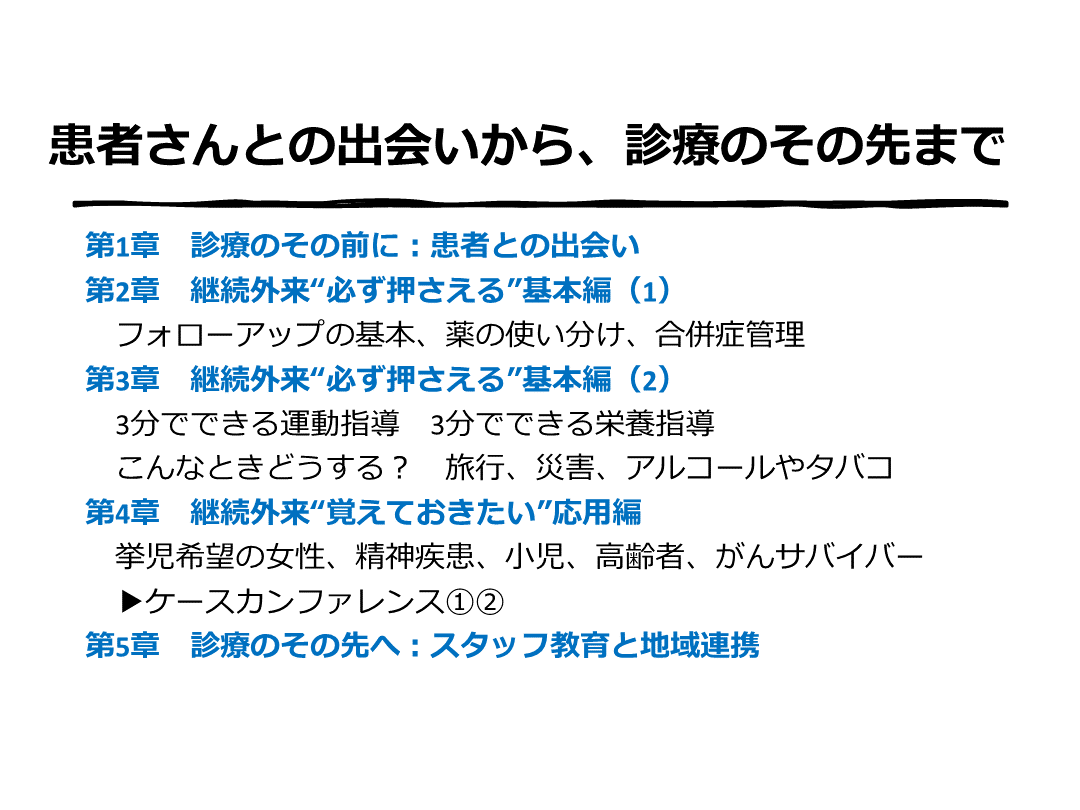 本スライドでは、2020年11月発行の『かゆいところに手が届く!まるわかり糖尿病塾』の概要と共に、“治療に前向きでない患者さんにどうアプローチする?”という視点、そして疾患(disease)だけでなく患者さんの病の経験(illness)を理解することの大切さを解説しています。