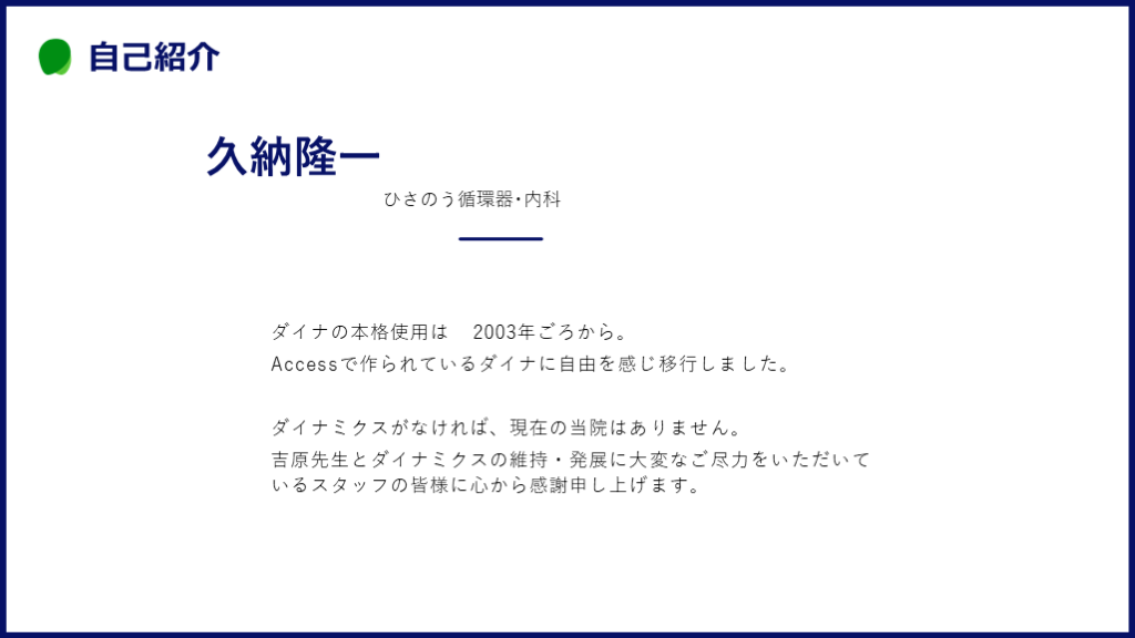 吉原先生とダイナミクスの維持・発展に大変なご尽力をいただいているスタッフの皆様に心から感謝申し上げます。 久納隆一 ひさのう循環器・内科