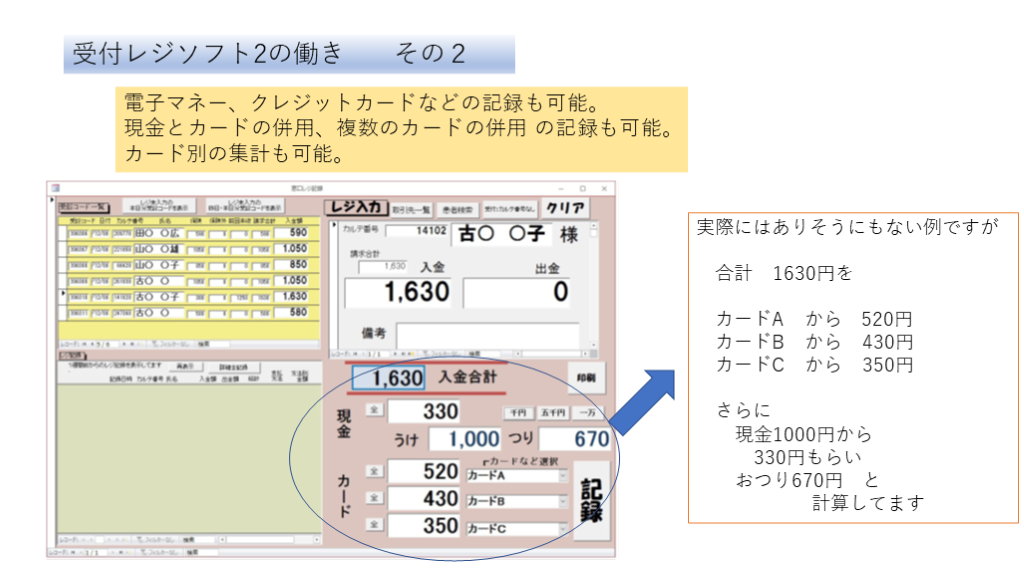 #5. 受付レジソフト2の働き その2 電子マネー、クレジットカードなどの記録も可能。