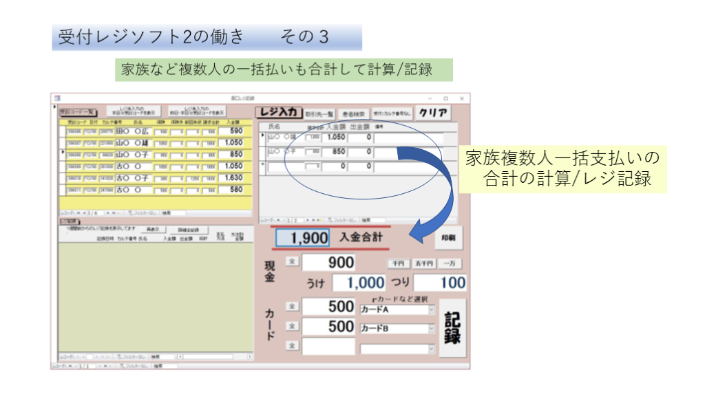 #6. 受付レジソフト2の働き その3 家族など複数人の一括払いも合計して計算/記録 家族複数人一括支払いの