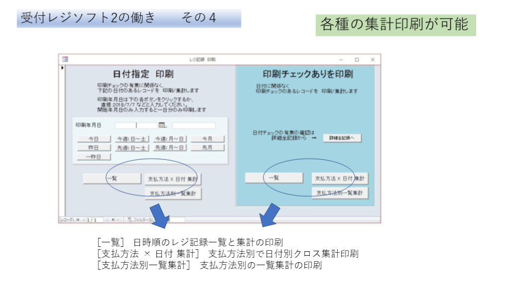 #7. 受付レジソフト2の働き その4 各種の集計印刷が可能 [一覧] 日時順のレジ記録一覧と集計の印刷