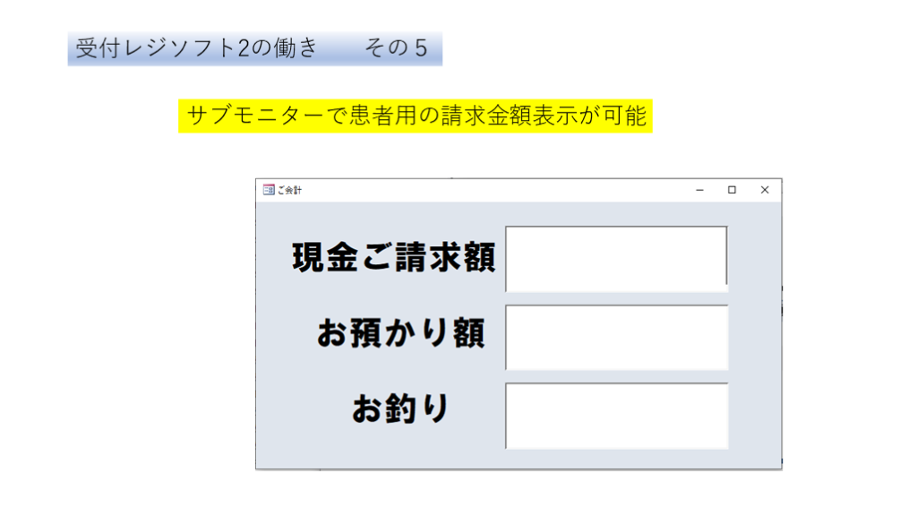 #8. 受付レジソフト2の働き その5 サブモニターで患者用の請求金額表示が可能