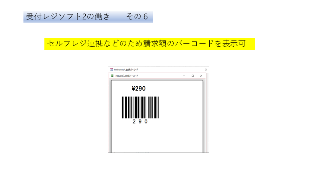 #9. 受付レジソフト2の働き その6 セルフレジ連携などのため請求額のバーコードを表示可