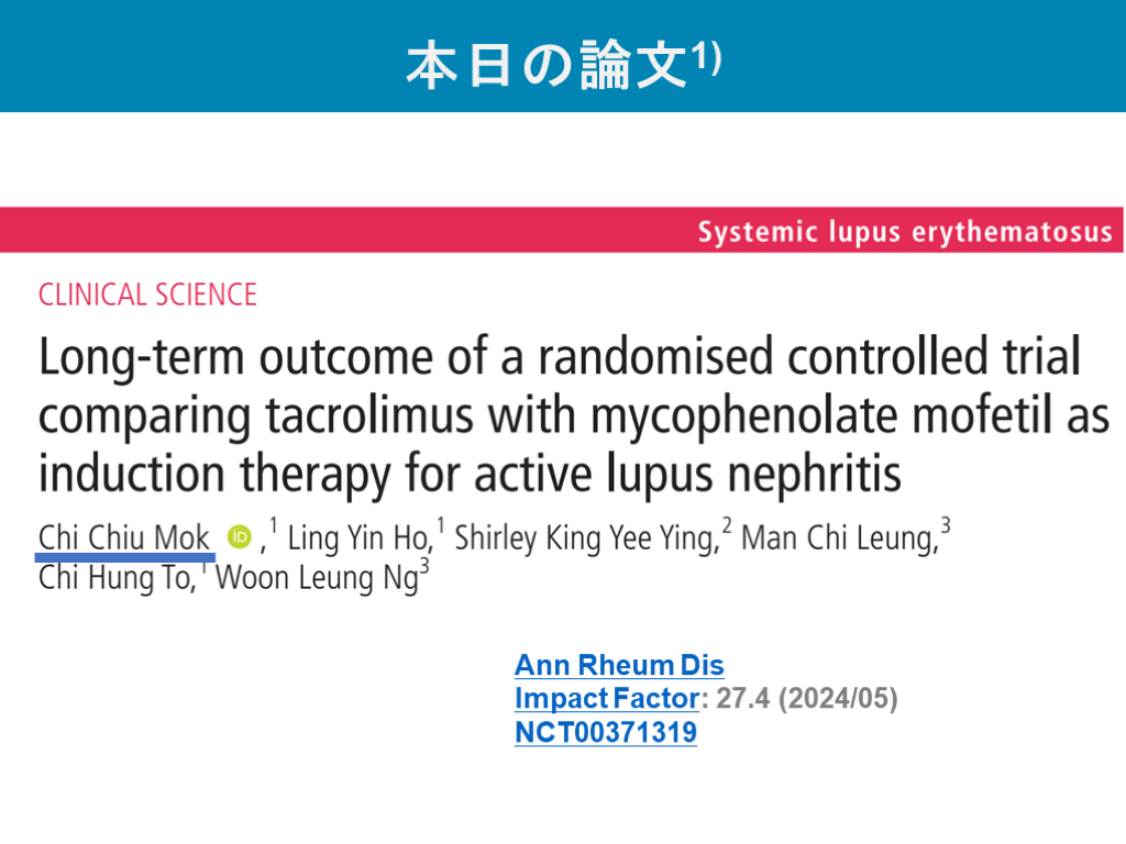 Mok CC, Ho LY, Ying SKY, et al. Long-term outcome of a randomized controlled trial comparing tacrolimus with mycophenolate mofetil as induction therapy for active lupus nephritis. Ann Rheum Dis. 2020 Aug;79(8):1070-1076.