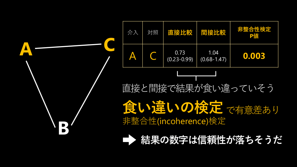 #10. C A 介入 対照 直接比較 間接比較 非整合性検定 P値 A C 0.73 (0.23-0.99) 1.04 (0.68-1.47) 0.003 直接と間接で結果が食い違っていそう B 食い違いの検定 で有意差あり 非整合性(incoherence)検定 結果の数字は信頼性が落ちそうだ