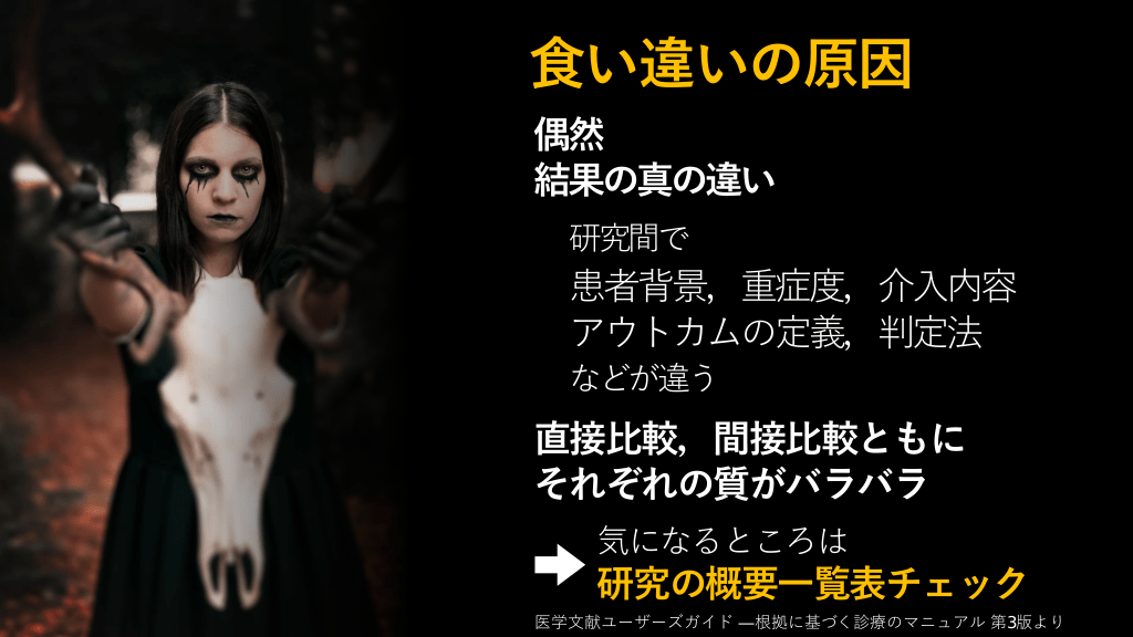 #11. 食い違いの原因 偶然 結果の真の違い 研究間で 患者背景,重症度,介入内容 アウトカムの定義,判定法 などが違う 直接比較,間接比較ともに それぞれの質がバラバラ 気になるところは 研究の概要一覧表チェック 医学文献ユーザーズガイド ―根拠に基づく診療のマニュアル 第3版より