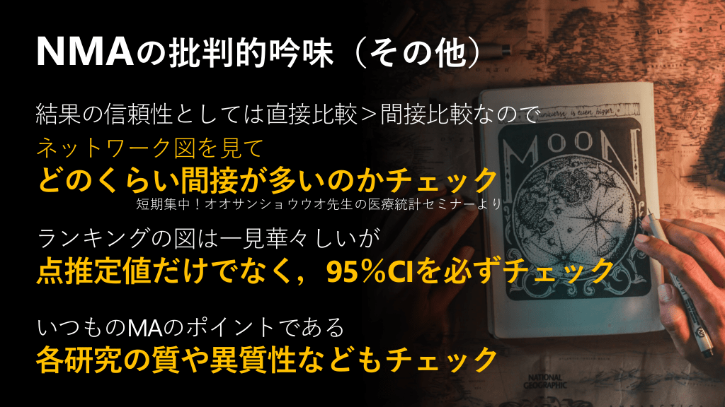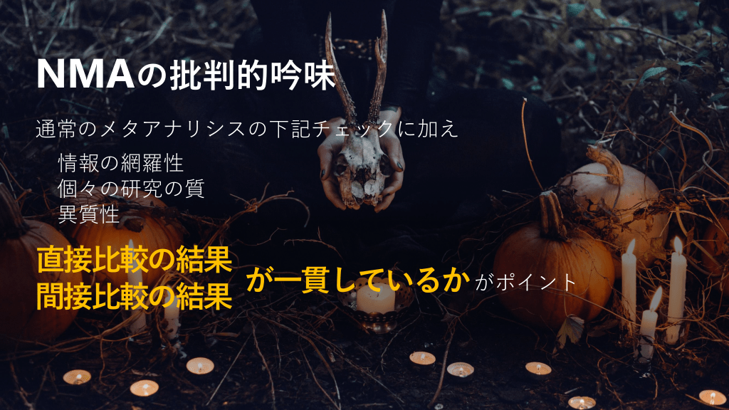 #8. NMAの批判的吟味 通常のメタアナリシスの下記チェックに加え 情報の網羅性 個々の研究の質 異質性 直接比較の結果 が一貫しているか がポイント 間接比較の結果