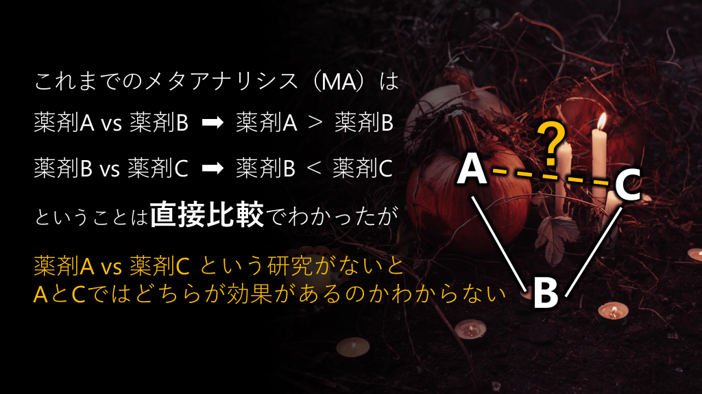 #3. これまでのメタアナリシス(MA)は 薬剤A vs 薬剤B 薬剤A > 薬剤B 薬剤B vs 薬剤C 薬剤B < 薬剤C ということは直接比較でわかったが ? A C 薬剤A vs 薬剤C という研究がないと AとCではどちらが効果があるのかわからない B