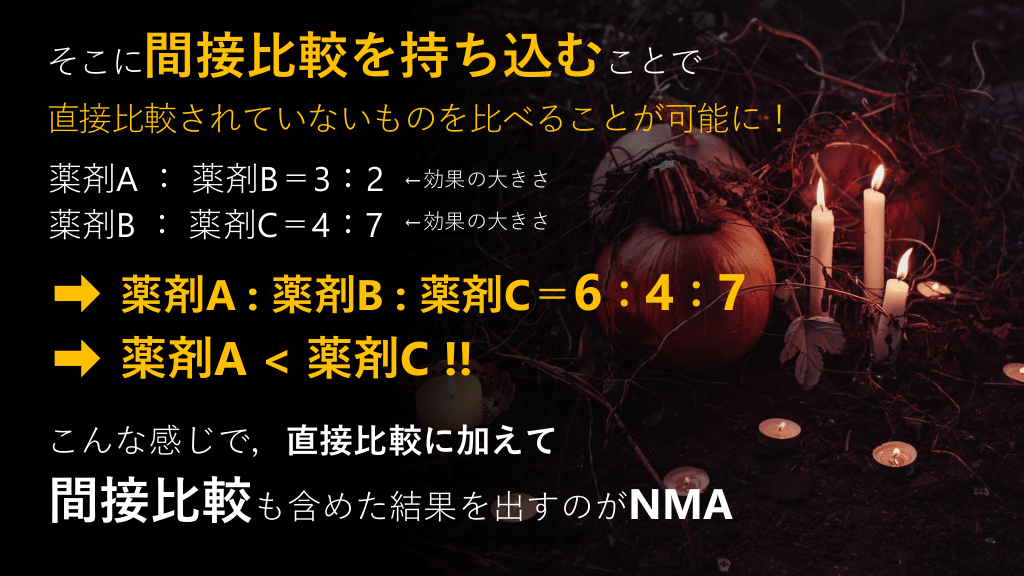 #4. そこに間接比較を持ち込むことで 直接比較されていないものを比べることが可能に! 薬剤A : 薬剤B=3:2 薬剤B : 薬剤C=4:7 ←効果の大きさ ←効果の大きさ 薬剤A : 薬剤B : 薬剤C=6:4:7 薬剤A < 薬剤C !! こんな感じで,直接比較に加えて 間接比較も含めた結果を出すのがNMA