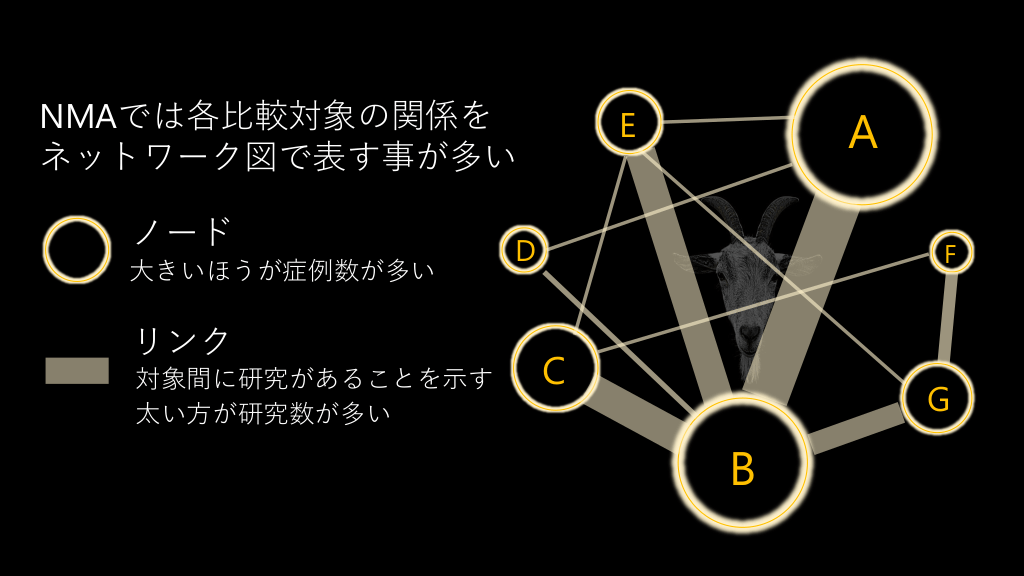 #2. ネットワークメタアナリシス(NMA)とは 「この中でどれがいい?」に対して,直接比較に加えて 間接比較も含めた結果を出すメタアナリシス