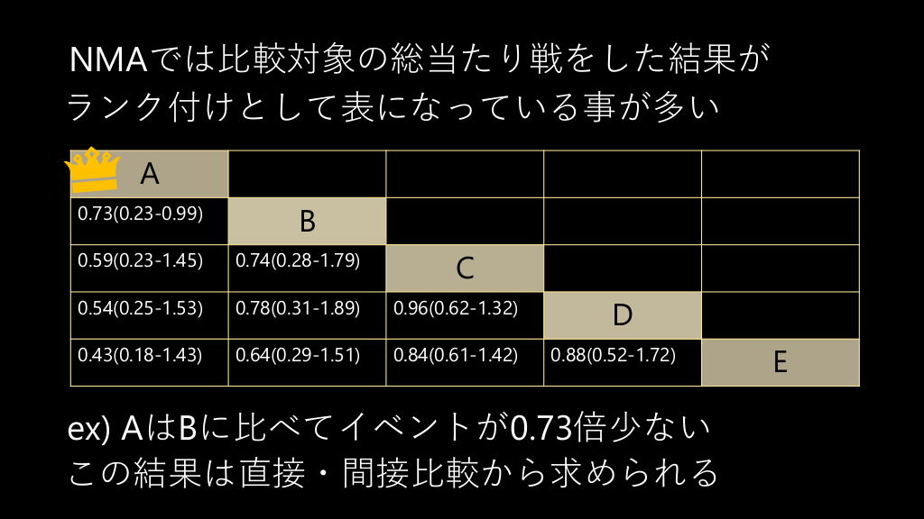 #6. NMAでは比較対象の総当たり戦をした結果が ランク付けとして表になっている事が多い A 0.73(0.23-0.99) B C 0.59(0.23-1.45) 0.74(0.28-1.79) 0.54(0.25-1.53) 0.78(0.31-1.89) 0.96(0.62-1.32) 0.43(0.18-1.43) 0.64(0.29-1.51) 0.84(0.61-1.42) D 0.88(0.52-1.72) ex) AはBに比べてイベントが0.73倍少ない この結果は直接・間接比較から求められる E