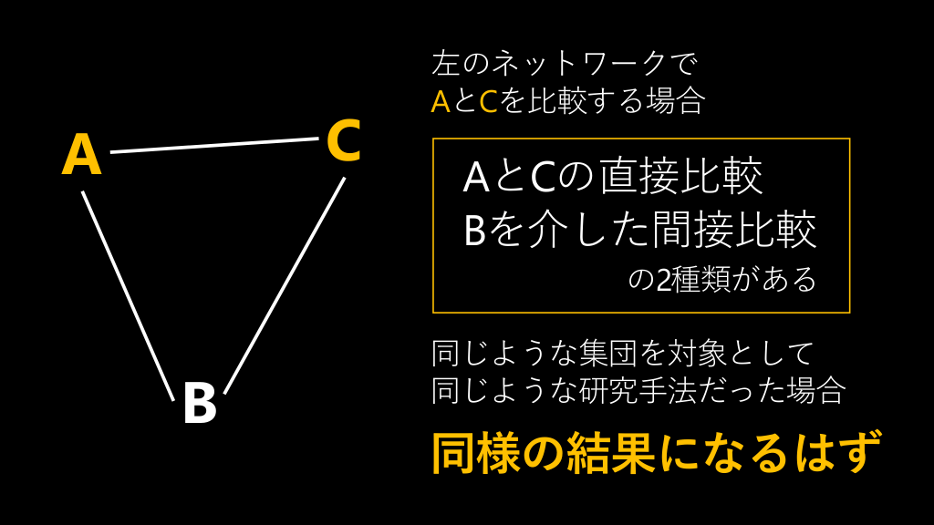 #9. C A 左のネットワークで AとCを比較する場合 AとCの直接比較 Bを介した間接比較 の2種類がある B 同じような集団を対象として 同じような研究手法だった場合 同様の結果になるはず