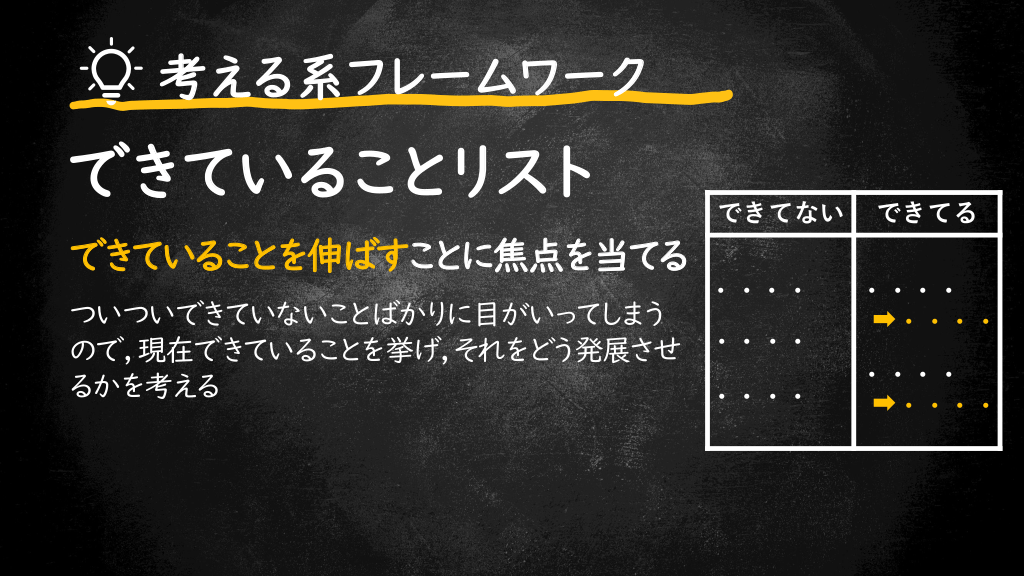#10. 考える系フレームワーク  できていることリスト  できてない  できてる  できていることを伸ばすことに焦点を当てる ・・・・  ついついできていないことばかりに目がいってしまう ので,現在できていることを挙げ,それをどう発展させ ・・・・ るかを考える ・・・・  ・・・・ ・・・・  ・・・・ ・・・・