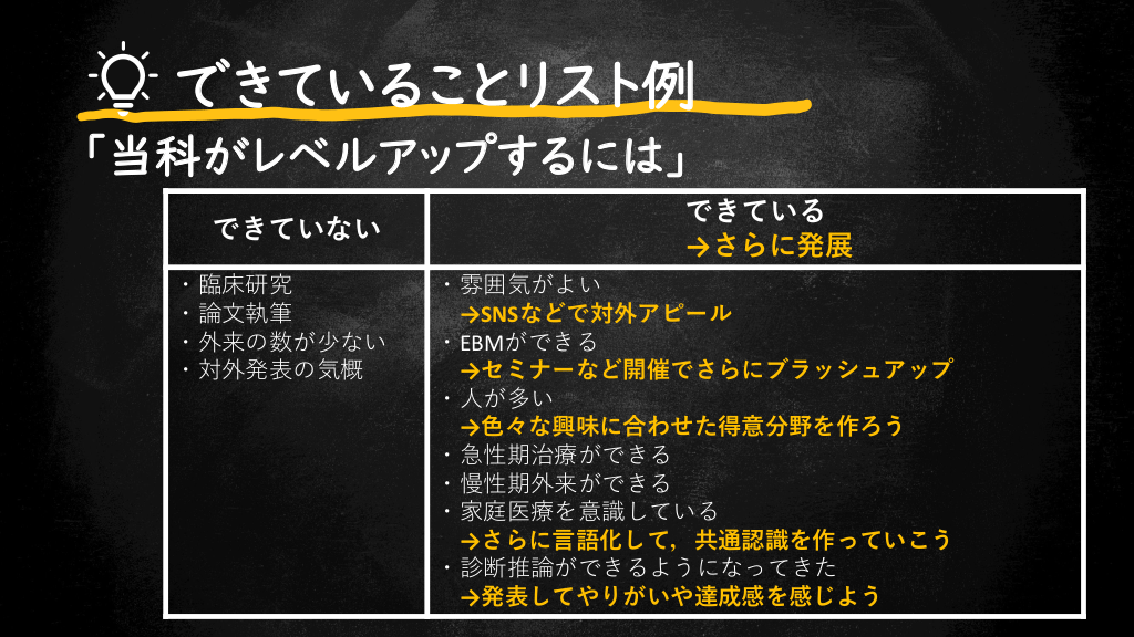 #11. できていることリスト例 「当科がレベルアップするには」 できていない ・臨床研究 ・論文執筆 ・外来の数が少ない ・対外発表の気概  できている →さらに発展 ・雰囲気がよい →SNSなどで対外アピール ・EBMができる →セミナーなど開催でさらにブラッシュアップ ・人が多い →色々な興味に合わせた得意分野を作ろう ・急性期治療ができる ・慢性期外来ができる ・家庭医療を意識している →さらに言語化して,共通認識を作っていこう ・診断推論ができるようになってきた →発表してやりがいや達成感を感じよう
