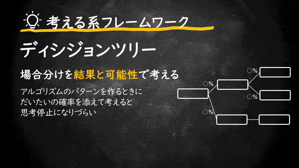 #12. 考える系フレームワーク  ディシジョンツリー ○%  場合分けを結果と可能性で考える ○%  アルゴリズムのパターンを作るときに だいたいの確率を添えて考えると 思考停止になりづらい  ○% ○%
