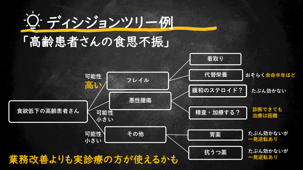 #13. ディシジョンツリー例 「高齢患者さんの食思不振」 看取り 可能性  高い  代替栄養 フレイル  おそらく余命半年ほど  緩和のステロイド?  たぶん効かない  精査・加療する?  診断できても 治療は困難  悪性腫瘍 食欲低下の高齢患者さん  可能性 小さい 可能性 小さい  その他  業務改善よりも実診療の方が使えるかも  胃薬  たぶん効かないが 一発逆転あり  抗うつ薬  たぶん効かないが 一発逆転あり