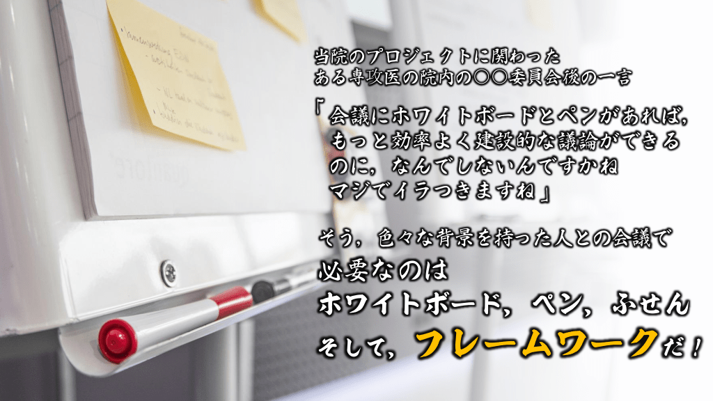 #3. 当院のプロジェクトに関わった ある専攻医の院内の○○委員会後の一言  「 会議にホワイトボードとペンがあれば, もっと効率よく建設的な議論ができる のに,なんでしないんですかね マジでイラつきますね 」 そう,色々な背景を持った人との会議で  必要なのは ホワイトボード,ペン,ふせん そして,フレームワークだ!