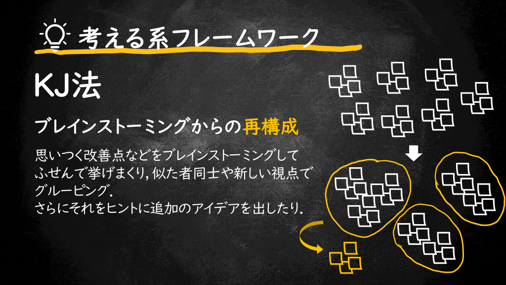 #6. 考える系フレームワーク  KJ法 ブレインストーミングからの再構成 思いつく改善点などをブレインストーミングして ふせんで挙げまくり,似た者同士や新しい視点で グルーピング. さらにそれをヒントに追加のアイデアを出したり.