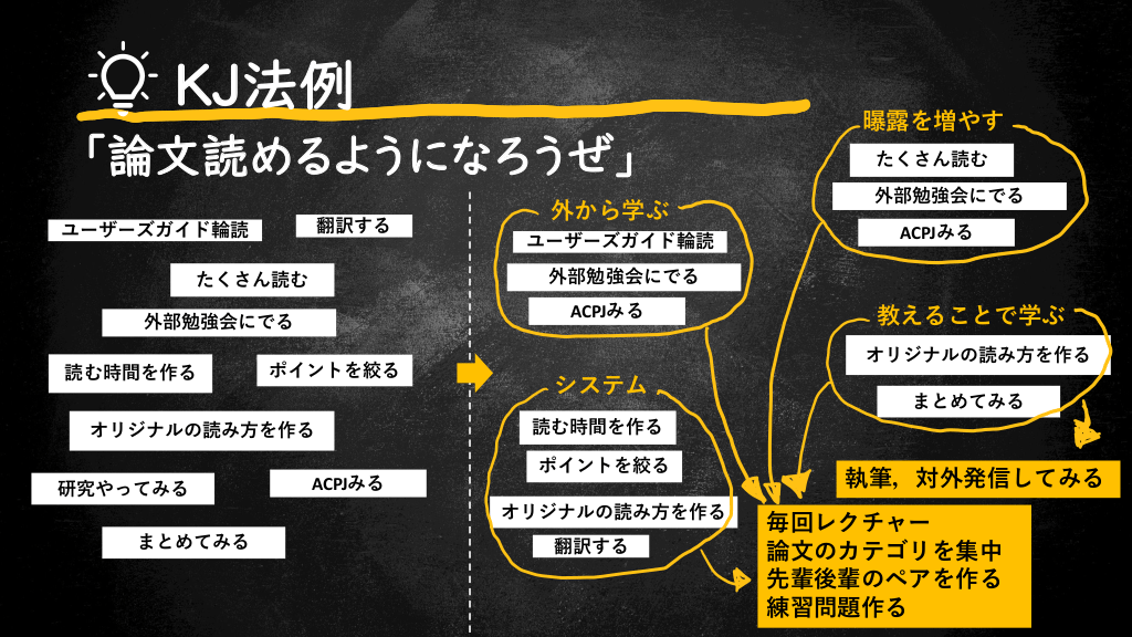 #7. KJ法例 「論文読めるようになろうぜ」 翻訳する  ユーザーズガイド輪読  ユーザーズガイド輪読  ACPJみる  外部勉強会にでる ポイントを絞る  オリジナルの読み方を作る  システム  ACPJみる  教えることで学ぶ  まとめてみる  読む時間を作る  ACPJみる オリジナルの読み方を作る  まとめてみる  外部勉強会にでる  オリジナルの読み方を作る  ポイントを絞る 研究やってみる  たくさん読む  外部勉強会にでる  たくさん読む  読む時間を作る  外から学ぶ  曝露を増やす  翻訳する  執筆,対外発信してみる 毎回レクチャー 論文のカテゴリを集中 先輩後輩のペアを作る 練習問題作る