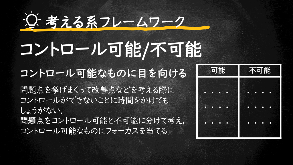 #8. 考える系フレームワーク  コントロール可能/不可能 コントロール可能なものに目を向ける  可能  不可能  問題点を挙げまくって改善点などを考える際に コントロールができないことに時間をかけても しょうがない. 問題点をコントロール可能と不可能に分けて考え, コントロール可能なものにフォーカスを当てる  ・・・・  ・・・・  ・・・・  ・・・・  ・・・・  ・・・・