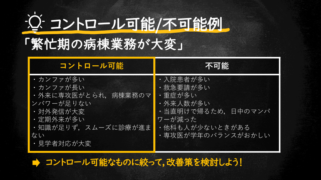 #9. コントロール可能/不可能例 「繁忙期の病棟業務が大変」 コントロール可能 ・カンファが多い ・カンファが長い ・外来に専攻医がとられ,病棟業務のマ ンパワーが足りない ・対外発信が大変 ・定期外来が多い ・知識が足りず,スムーズに診療が進ま ない ・見学者対応が大変  不可能 ・入院患者が多い ・救急要請が多い ・重症が多い ・外来人数が多い ・当直明けで帰るため,日中のマンパ ワーが減った ・他科も人が少ないときがある ・専攻医が学年のバランスがおかしい  コントロール可能なものに絞って,改善策を検討しよう!