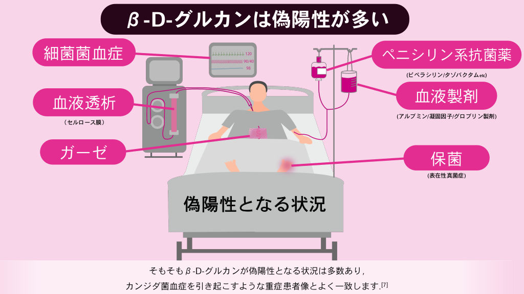 #10. β-D-グルカンは偽陽性が多い 細菌菌血症 ペニシリン系抗菌薬 (ピペラシリン/タゾバクタムetc) 血液製剤 血液透析 (アルブミン/凝固因子/グロブリン製剤) (セルロース膜) ガーゼ 保菌 (表在性真菌症) 偽陽性となる状況 そもそもβ-D-グルカンが偽陽性となる状況は多数あり, カンジダ菌血症を引き起こすような重症患者像とよく一致します.[7]