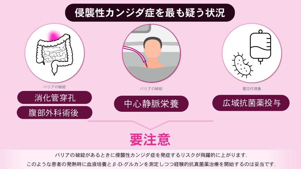 #11. 侵襲性カンジダ症を最も疑う状況 バリアの破綻 消化管穿孔 腹部外科術後 バリアの破綻 菌交代現象 中心静脈栄養 広域抗菌薬投与 要注意 バリアの破綻があるときに侵襲性カンジダ症を発症するリスクが飛躍的に上がります. このような患者の発熱時に血液培養とβ-D-グルカンを測定しつつ経験的抗真菌薬治療を開始するのは妥当です.
