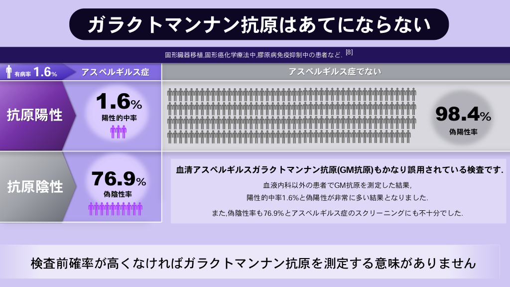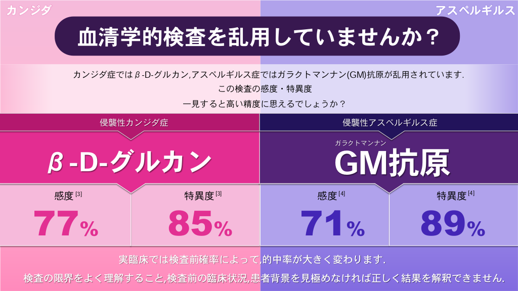 #8. カンジダ アスペルギルス 血清学的検査を乱用していませんか? カンジダ症ではβ-D-グルカン,アスペルギルス症ではガラクトマンナン(GM)抗原が乱用されています. この検査の感度・特異度 一見すると高い精度に思えるでしょうか? 侵襲性カンジダ症 侵襲性アスペルギルス症 β-D-グルカン 感度 [3] 77% 特異度 [3] 85% ガラクトマンナン GM抗原 感度 [4] 71% 特異度 [4] 89% 実臨床では検査前確率によって,的中率が大きく変わります. 検査の限界をよく理解すること,検査前の臨床状況,患者背景を見極めなければ正しく結果を解釈できません.