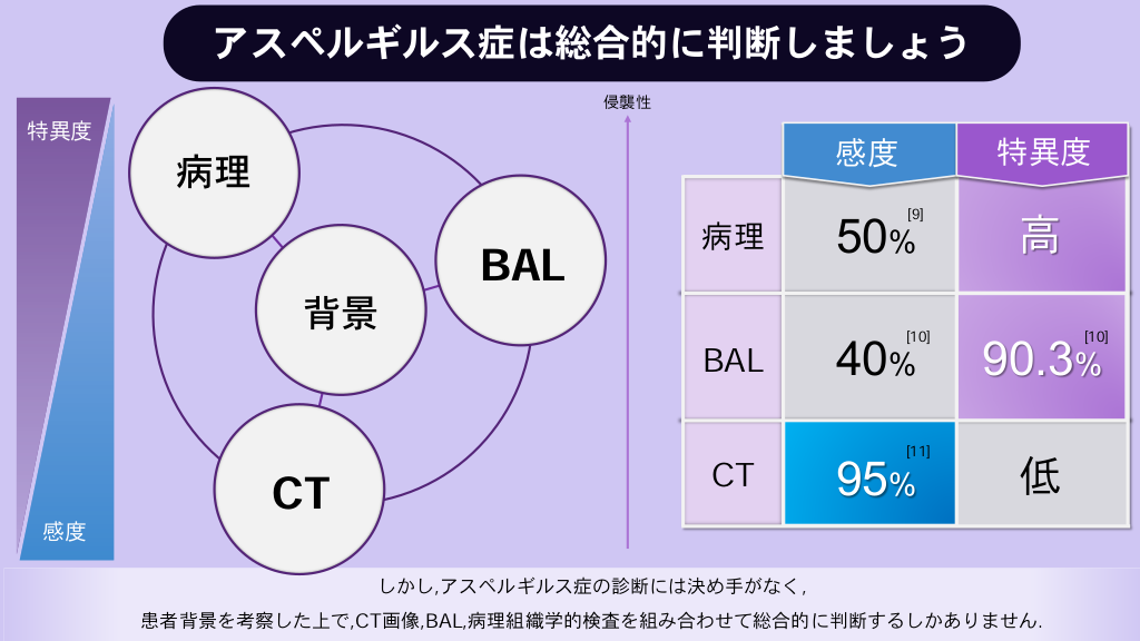 #13. アスペルギルス症は総合的に判断しましょう 侵襲性 特異度 病理 背景 感度 特異度 感度 CT BAL 病理 50% 高 BAL [10] 40% 90.3% [11] 低 CT [9] 95% [10] しかし,アスペルギルス症の診断には決め手がなく, 患者背景を考察した上で,CT画像,BAL,病理組織学的検査を組み合わせて総合的に判断するしかありません.