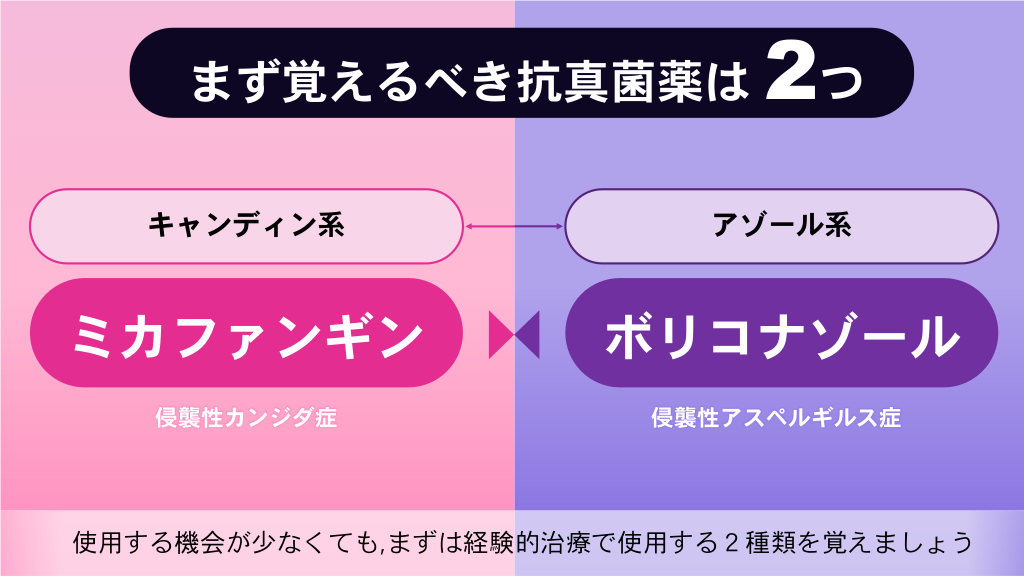 #14. まず覚えるべき抗真菌薬は 2つ キャンディン系 アゾール系 ミカファンギン ボリコナゾール 侵襲性カンジダ症 侵襲性アスペルギルス症 使用する機会が少なくても,まずは経験的治療で使用する2種類を覚えましょう
