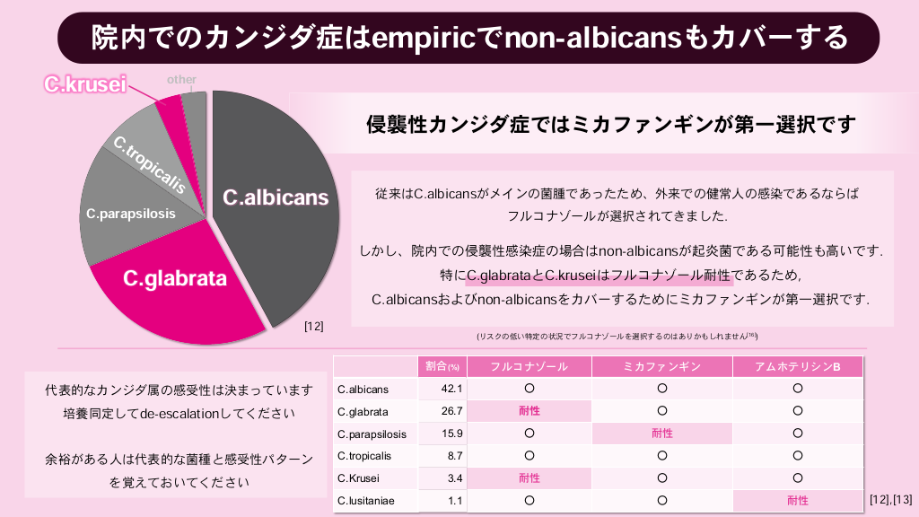 #15. 院内でのカンジダ症はempiricでnon-albicansもカバーする C.krusei other 侵襲性カンジダ症ではミカファンギンが第一選択です C.parapsilosis C.albicans 従来はC.albicansがメインの菌腫であったため、外来での健常人の感染であるならば フルコナゾールが選択されてきました. しかし、院内での侵襲性感染症の場合はnon-albicansが起炎菌である可能性も高いです. C.glabrata 特にC.glabrataとC.kruseiはフルコナゾール耐性であるため, C.albicansおよびnon-albicansをカバーするためにミカファンギンが第一選択です. [12] (リスクの低い特定の状況でフルコナゾールを選択するのはありかもしれません[16]) 割合(%) フルコナゾール ミカファンギン アムホテリシンB 代表的なカンジダ属の感受性は決まっています C.albicans 42.1 〇 〇 〇 培養同定してde-escalationしてください C.glabrata 26.7 耐性 〇 〇 C.parapsilosis 15.9 〇 耐性 〇 C.tropicalis 8.7 〇 〇 〇 C.Krusei 3.4 耐性 〇 〇 C.lusitaniae 1.1 〇 〇 耐性 余裕がある人は代表的な菌種と感受性パターン を覚えておいてください [12],[13]