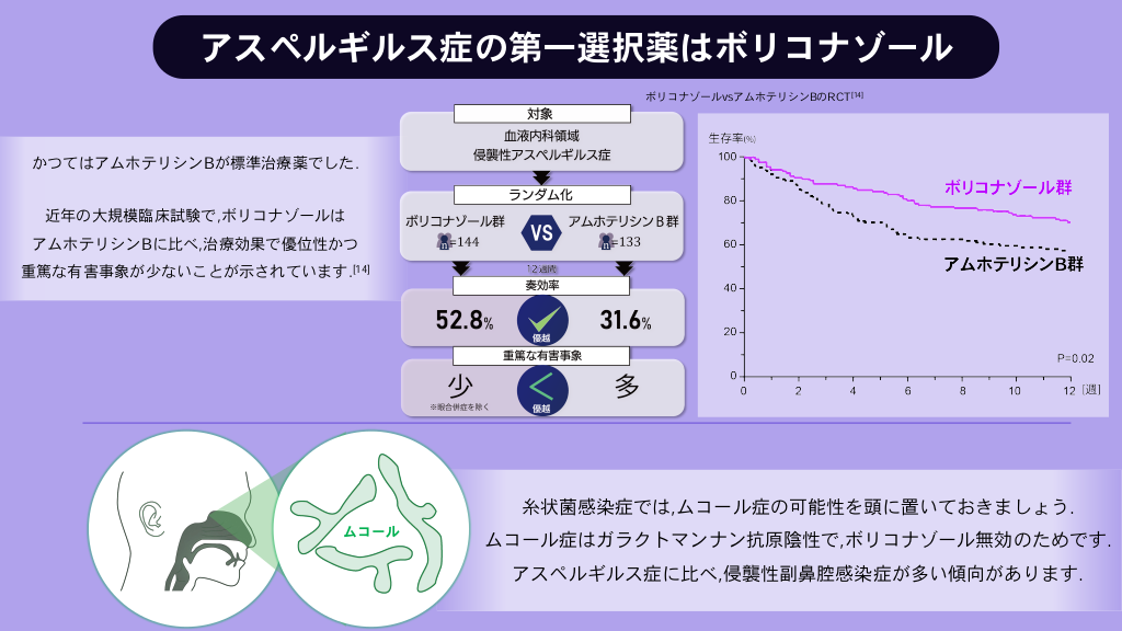 #16. アスペルギルス症の第一選択薬はボリコナゾール ボリコナゾールvsアムホテリシンBのRCT[14] かつてはアムホテリシンBが標準治療薬でした. 近年の大規模臨床試験で,ボリコナゾールは アムホテリシンBに比べ,治療効果で優位性かつ 重篤な有害事象が少ないことが示されています.[14] 糸状菌感染症では,ムコール症の可能性を頭に置いておきましょう. ムコール ムコール症はガラクトマンナン抗原陰性で,ボリコナゾール無効のためです. アスペルギルス症に比べ,侵襲性副鼻腔感染症が多い傾向があります.