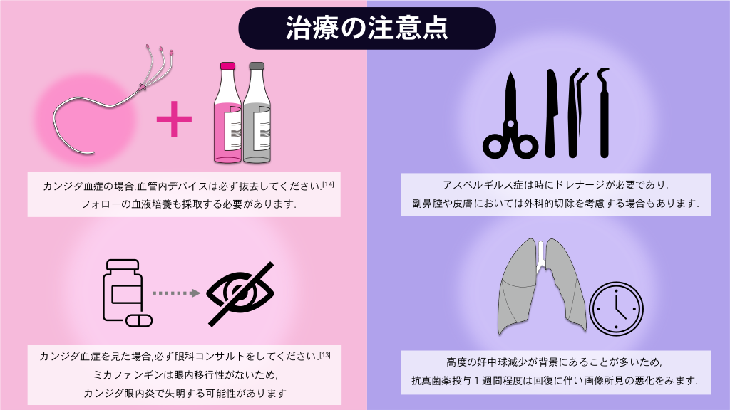 #17. 治療の注意点 カンジダ血症の場合,血管内デバイスは必ず抜去してください.[14] アスペルギルス症は時にドレナージが必要であり, フォローの血液培養も採取する必要があります. 副鼻腔や皮膚においては外科的切除を考慮する場合もあります. カンジダ血症を見た場合,必ず眼科コンサルトをしてください.[13] ミカファンギンは眼内移行性がないため, カンジダ眼内炎で失明する可能性があります 高度の好中球減少が背景にあることが多いため, 抗真菌薬投与1週間程度は回復に伴い画像所見の悪化をみます.