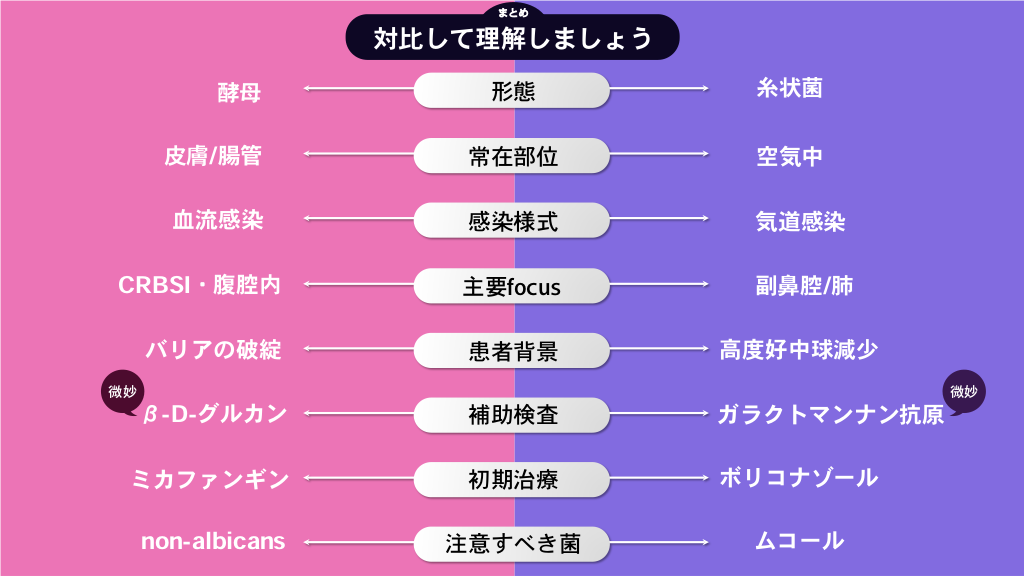 #18. まとめ 対比して理解しましょう 形態 糸状菌 皮膚/腸管 常在部位 空気中 血流感染 感染様式 気道感染 CRBSI・腹腔内 主要focus 副鼻腔/肺 バリアの破綻 患者背景 高度好中球減少 酵母 微妙 β-D-グルカン 補助検査 ガラクトマンナン抗原 ミカファンギン 初期治療 ボリコナゾール non-albicans 注意すべき菌 ムコール 微妙