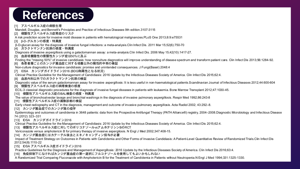 #19. References [1] アスペルギルス症の病態生理 Mandell, Douglas, and Bennett's Principles and Practice of Infectious Diseases 9th edition.3107-3115 [2] 侵襲性アスペルギルス症発症のリスク A risk prediction score for invasive mold disease in patients with hematological malignancies.PLoS One 2013;8:9:e75531 [3] β-D-グルカンの感度・特異度 β-D-glucan assay for the diagnosis of invasive fungal infections: a meta-analysis.Clin Infect Dis. 2011 Mar 15;52(6):750-70 [4] ガラクトマンナン抗原の感度・特異度 Diagnosis of invasive aspergillosis using a galactomannan assay: a meta-analysis.Clin Infect Dis. 2006 May 15;42(10):1417-27. [5] 血液培養陰性の侵襲性カンジダ症は50%に及ぶ Finding the "missing 50%" of invasive candidiasis: how nonculture diagnostics will improve understanding of disease spectrum and transform patient care. Clin Infect Dis 2013;56:1284-92. [6] 各患者層ごとのカンジダ菌血症に対する培養以外の陽性的中率の検証 Non-culture diagnostics for invasive candidiasis: promise and unintended consequences. J Fungi(Basel) 2048:4 [7] IDSA カンジダガイドライン2016 (BDG偽陽性となる状況) Clinical Practice Guideline for the Manag