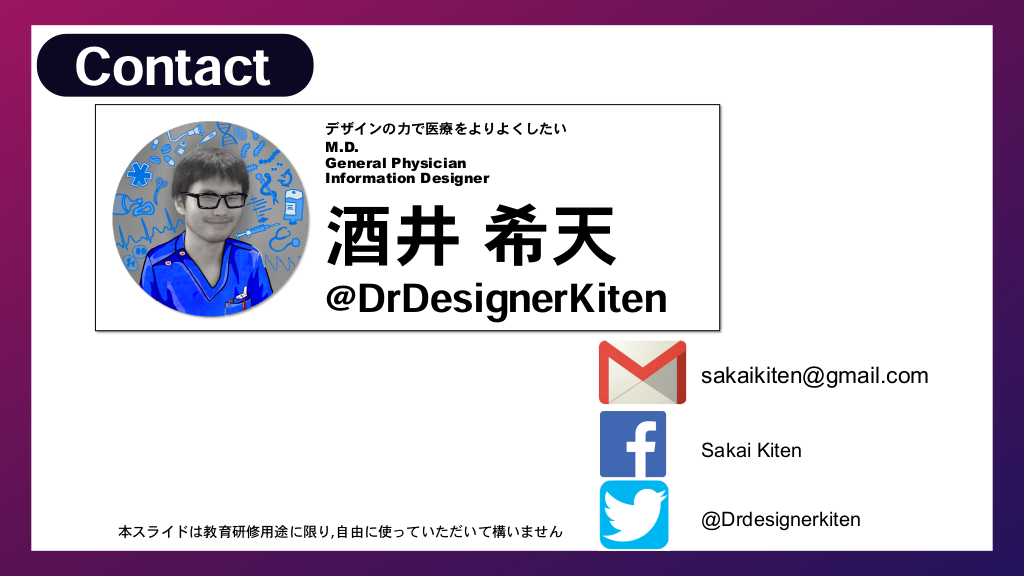 #20. Contact デザインの力で医療をよりよくしたい M.D. General Physician Information Designer 酒井 希天 @DrDesignerKiten sakaikiten@gmail.com Sakai Kiten 本スライドは教育研修用途に限り,自由に使っていただいて構いません @Drdesignerkiten