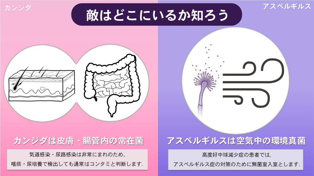 #4. カンジダ 敵はどこにいるか知ろう アスペルギルス カンジダは皮膚・腸管内の常在菌 アスペルギルスは空気中の環境真菌 気道感染・尿路感染は非常にまれのため, 高度好中球減少症の患者では, 喀痰・尿培養で検出しても通常はコンタミと判断します. アスペルギルス症の対策のために無菌室入室とします.