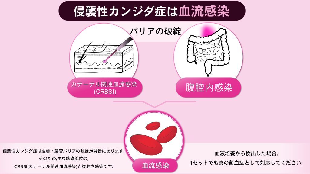 #5. 侵襲性カンジダ症は血流感染 バリアの破綻 カテーテル関連血流感染 (CRBSI) 腹腔内感染 侵襲性カンジダ症は皮膚・腸管バリアの破綻が背景にあります. 血液培養から検出した場合, そのため,主な感染部位は, CRBSI(カテーテル関連血流感染)と腹腔内感染です. 血流感染 1セットでも真の菌血症として対応してください.