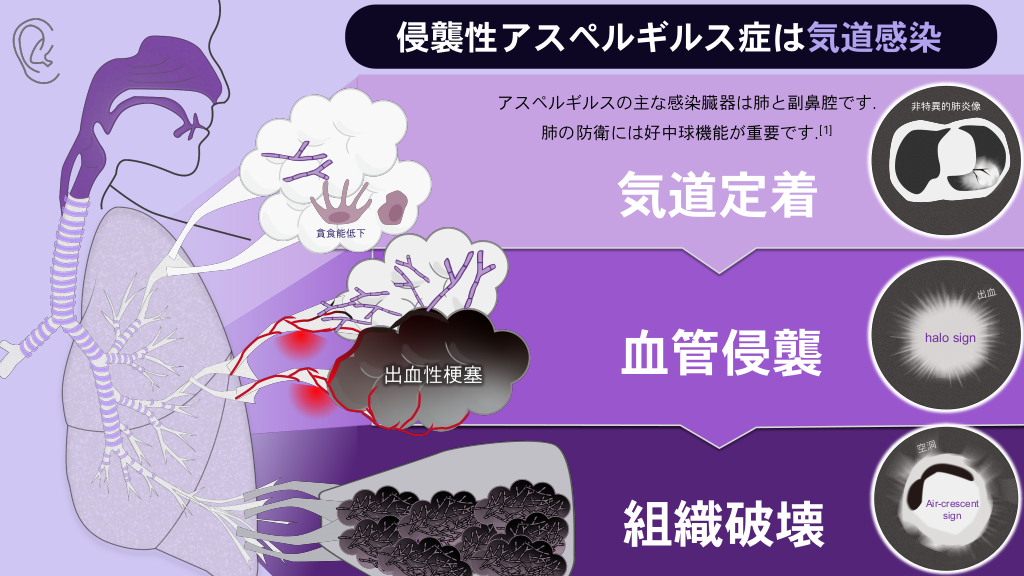 #6. 侵襲性アスペルギルス症は気道感染 アスペルギルスの主な感染臓器は肺と副鼻腔です. 非特異的肺炎像 肺の防衛には好中球機能が重要です.[1] 気道定着 貪食能低下 出血性梗塞 血管侵襲 組織破壊 halo sign Air-crescent sign